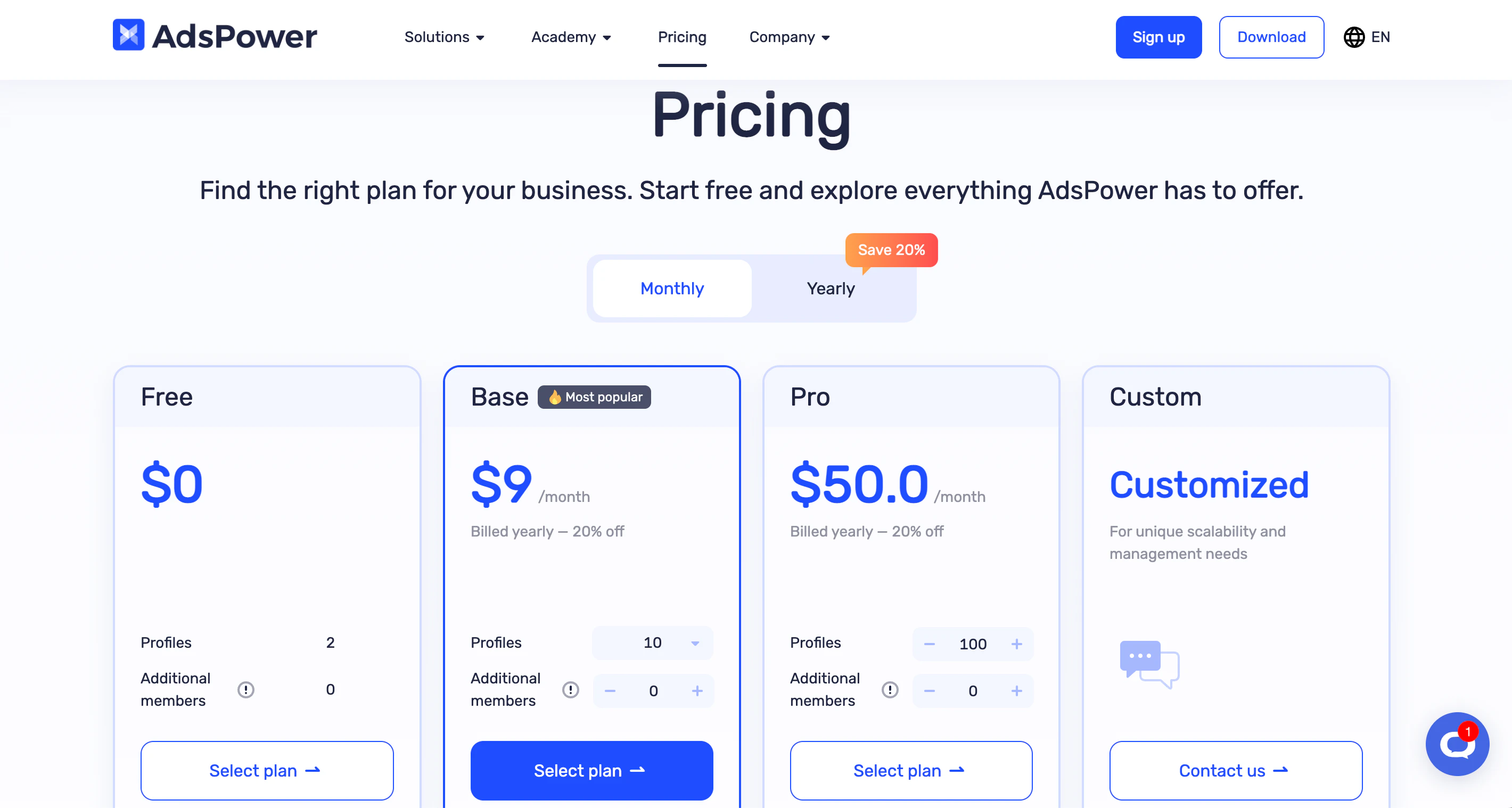 AdsPower 允許您選擇自定義數量的團隊成員和個人資料,並在最後相應地計算價格。這樣,您就不會為不需要的功能支付過高的費用,這使得 AdsPower 成為那些需要靈活功能的人的絕佳選擇。