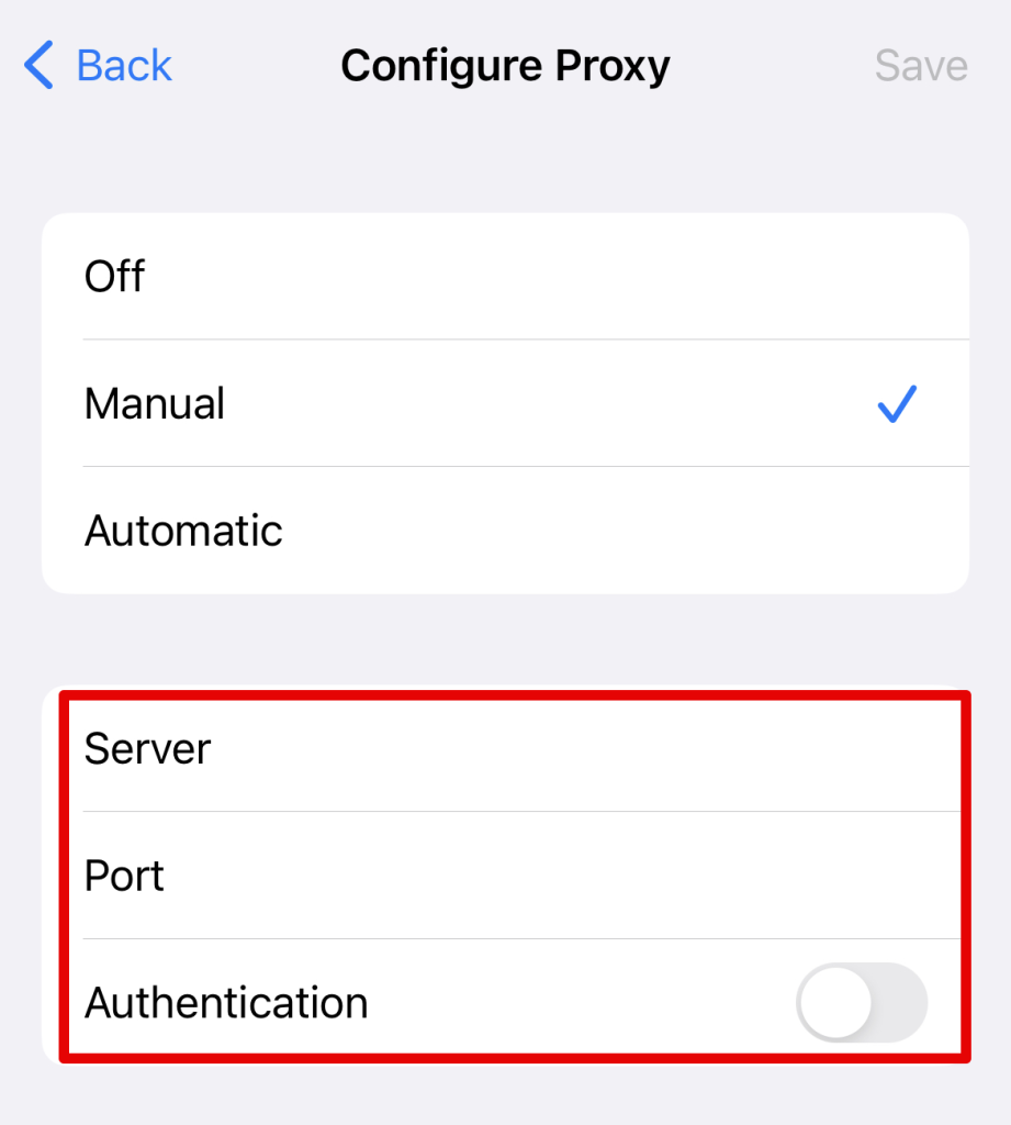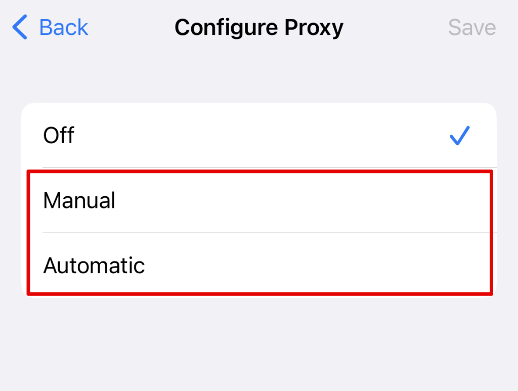 iOS 上的代理設置與 Android 上的代理設置相同,但略有變化。當您的 iOS 設備在將其設置為自動檢測服務器時發現不需要使用代理服務器時,設備將不會使用代理服務器創建連接。但是,要創建代理服務器,您可以使用代理配置腳本並將其輸入到 URL 部分。